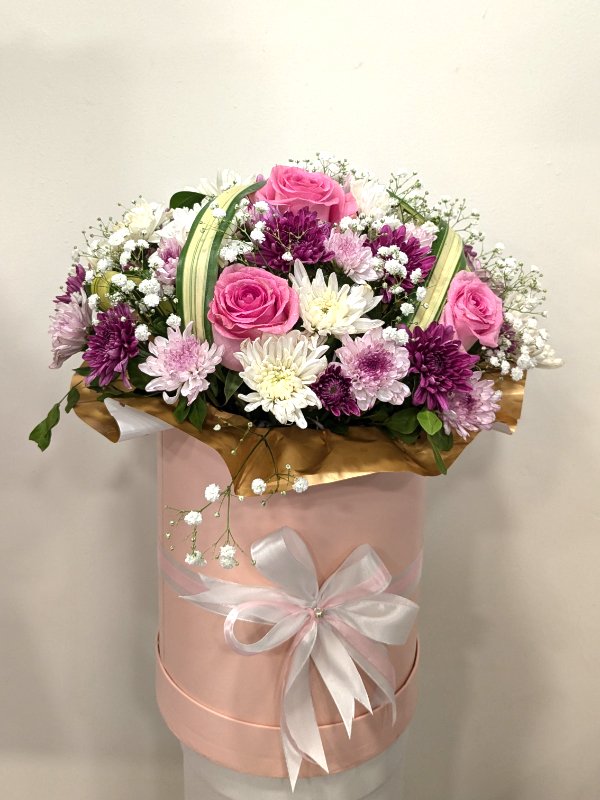pink Round Box Imp Roses Chrysanthemum Gypso