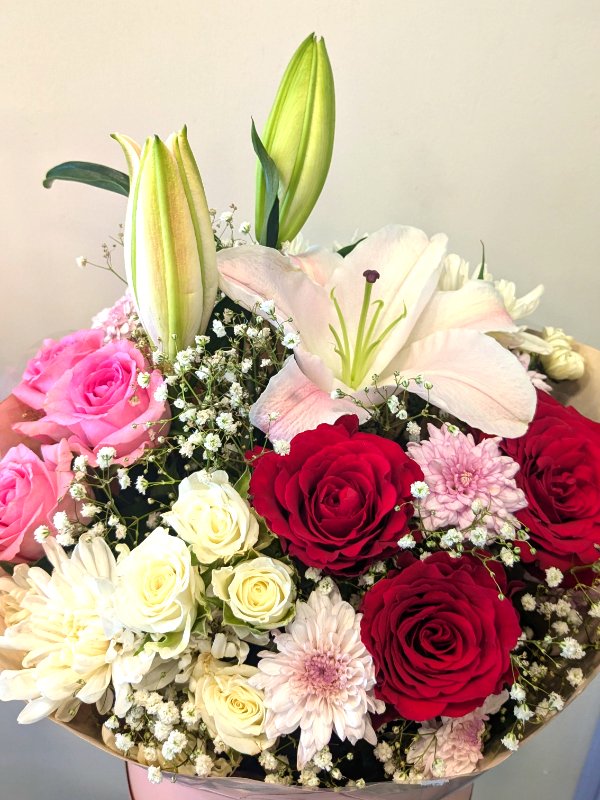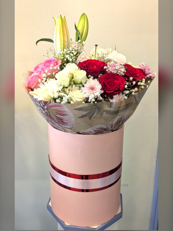 Round Box Large, Imp Roses, Spray Roses, Lily, Chrysanthemum/Daisy, Gypso